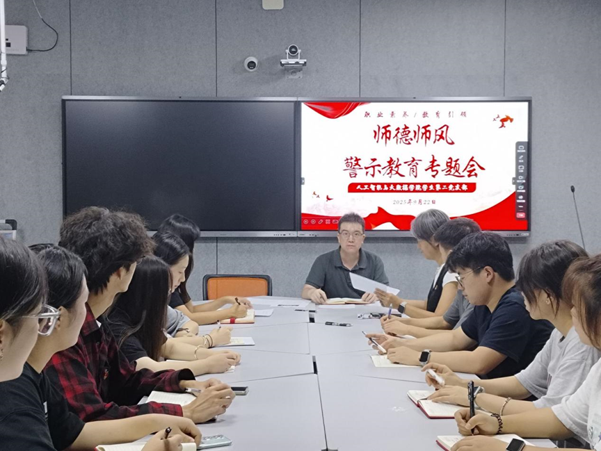 为进一步强化教师党员师德修养,严守职业底线,人工智能与大数据学院学生第二党支部于2025年9月22日在三教 208 教室召开师德师风警示教育专题会暨师风师德系列主题活动。会议由学生第二党支部书记卢风帆同志主持,全体教师党员参会。