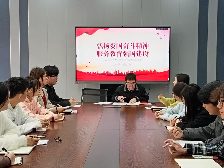 为深入弘扬爱国奋斗精神,凝聚服务教育强国建设的奋进力量,人工智能与大数据学院学生第二党支部于 2025 年 10 月 27 日在三教 208 教室开展“弘扬爱国奋斗精神,服务教育强国建设”主题党日活动。本次活动由学生第二党支部书记卢风帆同志主持,全体党员参会并学习。