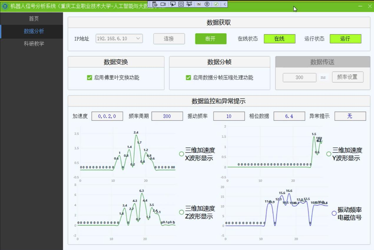 针对工业机器人关键零部件(电机、减速机等)维护难度大、故障数据获取难等行业痛点,我院团队成功构建了从数据感知到智能决策的完整技术体系。项目组创新性地研制了集成多传感器的无线智能采集装置,通过“定时器中断+DMA+频域对齐”技术,实现了多源异构数据的微秒级同步采集 。在算法层面,团队融合了WGAN生成对抗网络与轻量化一维卷积神经网络(SRIPCNN-1D),在故障样本极度不均衡的情况下,依然实现了超过98%的复合故障诊断准确率 。目前,该原型系统已在埃夫特(EFORT)等主流机器人平台完成工程验证,可有效降低企业维护成本20%-30%,显著提升了国产工业机器人的运行可靠性。